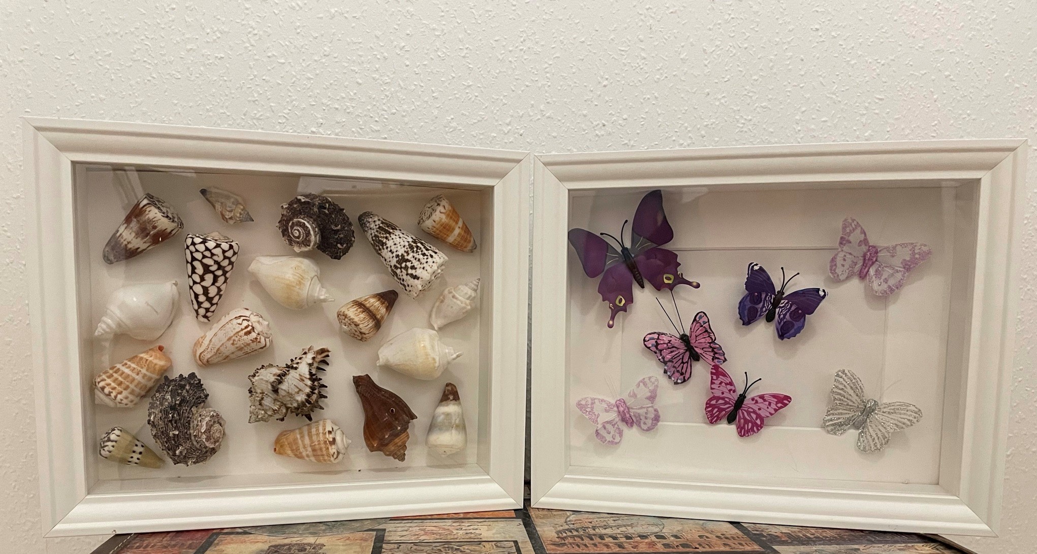 Her er 3D rammer altså fantastiske, for man kan sætte ting i, i stedet for billeder/fotos. Denne gang har jeg taget nogle sommerfugle som bare er limet på den pap der følger med. Den skal nu have plads på Olivias værelse. Når nu jeg var i gang, har jeg lavet en ramme med muslingeskaller til badeværelset. Det er supernemt at lave, og fortryder man senere, så er det lige til at hive ud, og så kan man så fylde op med, hvad humøret er til nu.