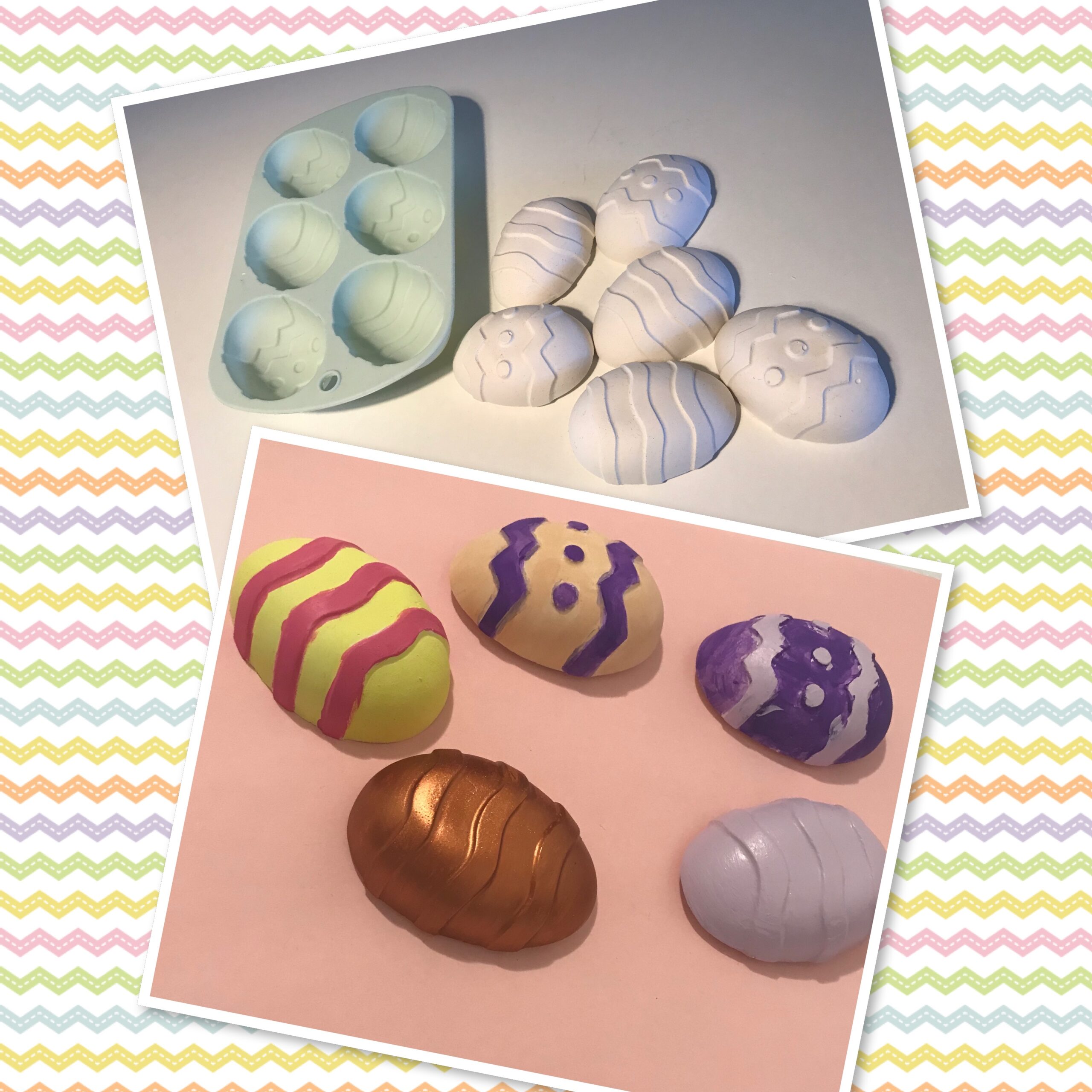 Nu er det snart påske og der skal traditionen tro pyntes op. Olivia elsker at lave kreative projekter, og vil naturligvis selv lave påskepynt. I mine skabe fandt jeg en silikone form til chokoladeæg, men for at være helt ærlig, så er det nok ikke et projekt jeg får lavet. Men da den er af silikone, kan den jo også bruges til gips, så chokoladepåskeæg blev til gipspåskeæg – de er nu også lidt lettere at male.