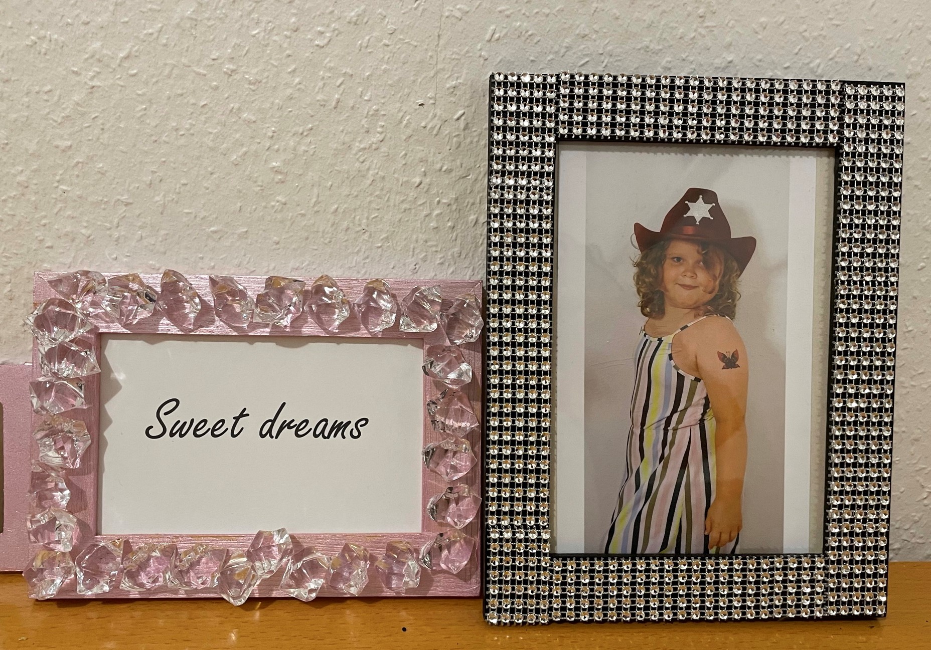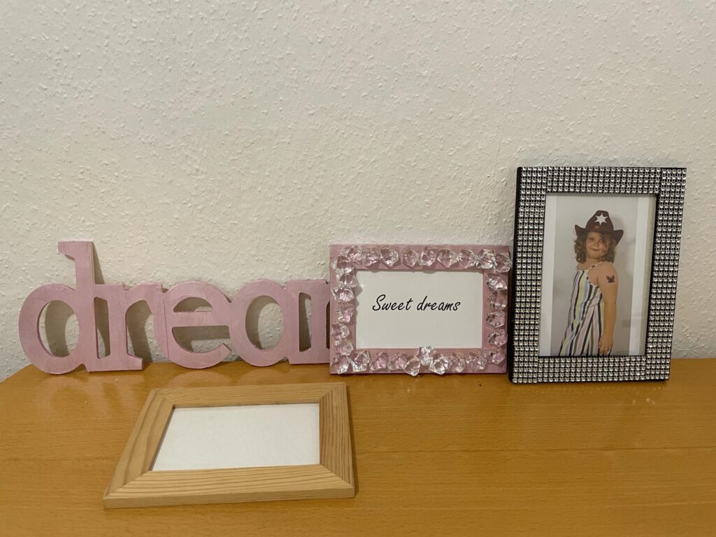 Vi har lavet rammer igen. Denne gang har vi pyntet nogle billige trærammer. Først er de malet og bagefter er de pyntet. Den ene ramme er med noget bånd jeg havde liggende og så ville Olivia have en med store ”diamanter” så det fik hun selvfølgelig. Rammerne er lette at lave, og så koster de ikke ret meget. I vores tilfælde, fandt vi bare ting i skabene, som vi kunne lime på. Det gælder bare om at bruge sin fantasi.